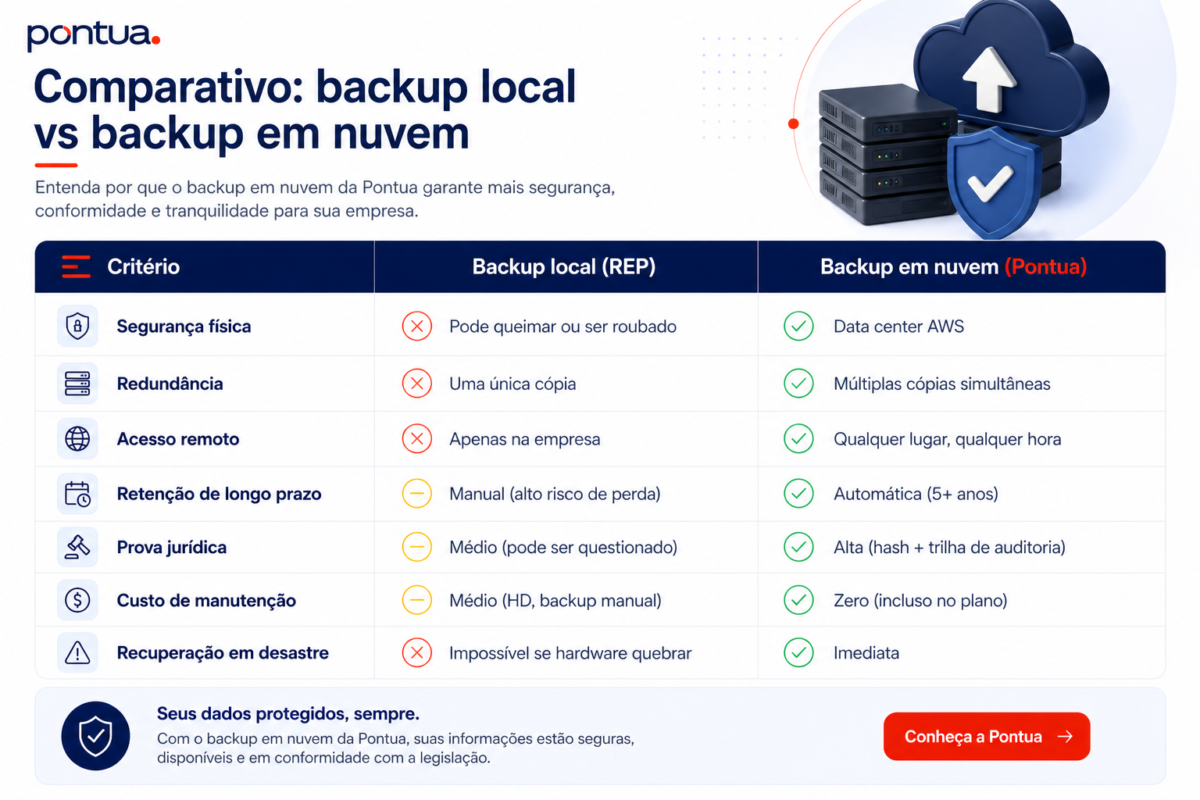 O REP local oferece risco médio: os dados existem, mas um único evento físico pode apagá-los para sempre. A Pontua, com backup automático em nuvem AWS, reduz esse risco a zero como resultado. Desse modo, cada marcação é armazenada, criptografada, auditável e recuperável a qualquer momento — por até cinco anos ou mais, em conformidade com a Portaria 671 e com o eSocial.